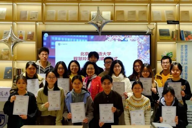 会见结束后,“北京外国语大学程慧玲奖学金”颁奖仪式举行。程慧玲与本硕博获奖学生欢聚一堂,共同见证这一时刻。来自德语学院的本科生在活动上带来了精彩的中德双语朗诵,现场气氛温馨而热烈。